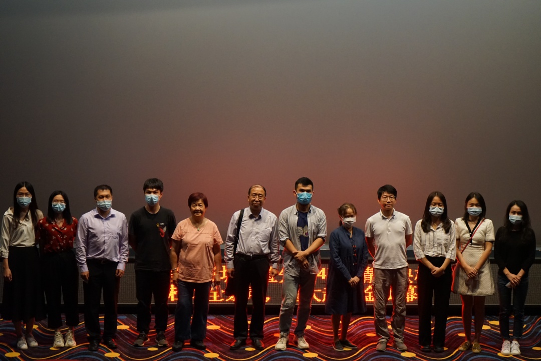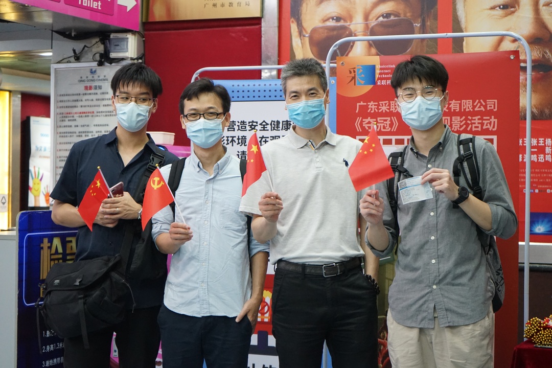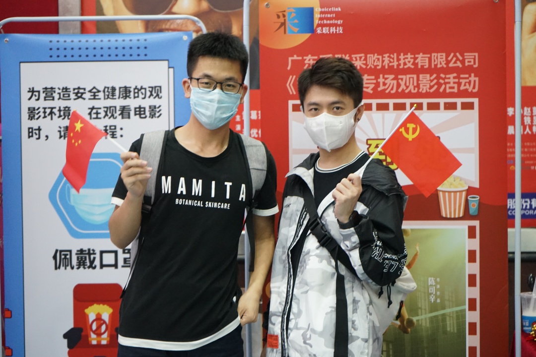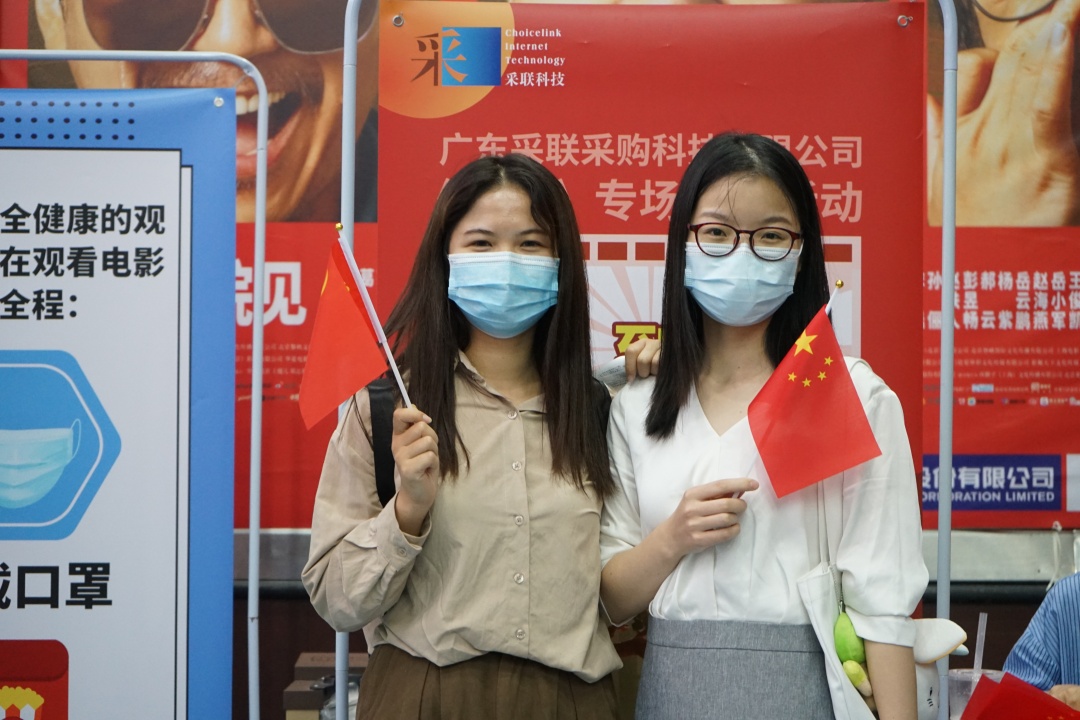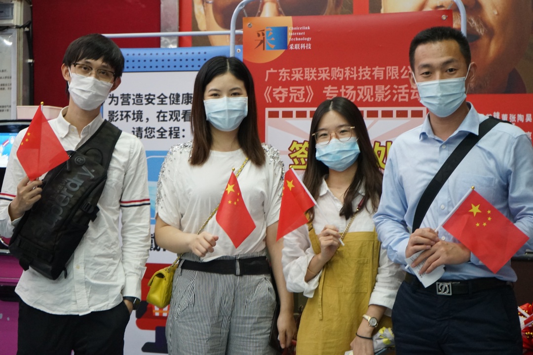 10月14日18點,報名前來觀影的群眾陸續在簽到領票。在簽到處,采聯為大家準備了國旗。簽到完畢大家興高采烈地拿著國旗合照留影。