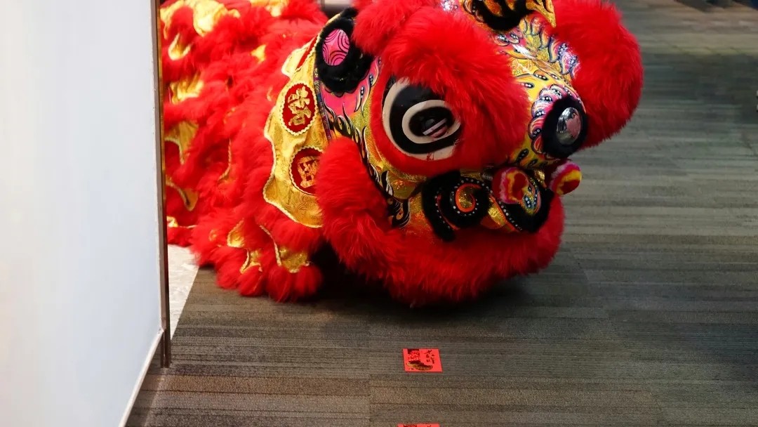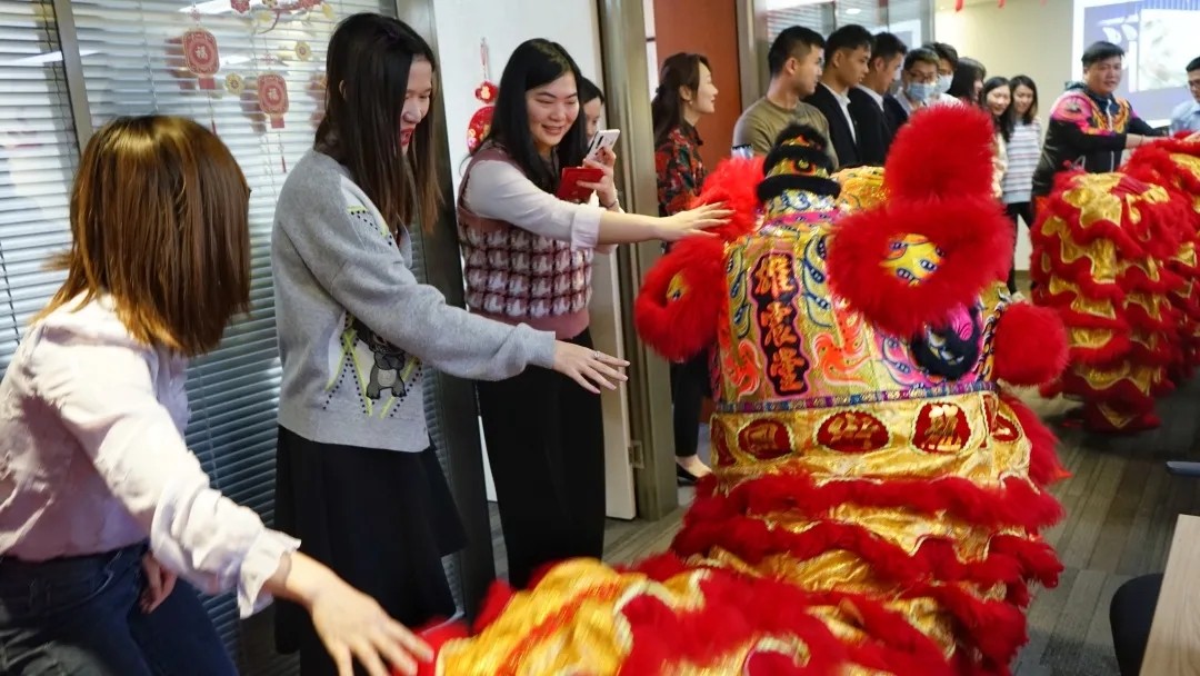 隨后,瑞獅跟隨地面上的紅包,走進領導們的辦公室。瑞獅采“利是”,寓意著新的一年興旺生財。