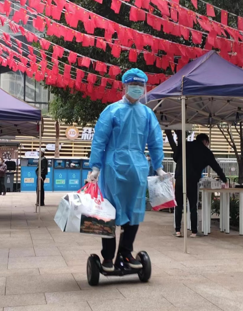 “騎平衡車的這個(gè)小伙子,我們?cè)谶@等到拿東西,看到跑了好多趟了喲,忙前忙后的,嘿熱心!”“平衡車速度快,一陣風(fēng)吹過,人不見了”“帥呆了”“超酷”………這位被封控區(qū)群眾交口稱贊的“風(fēng)一樣”的“90后”小哥名叫顏超,是華包集團(tuán)一名普通員工。